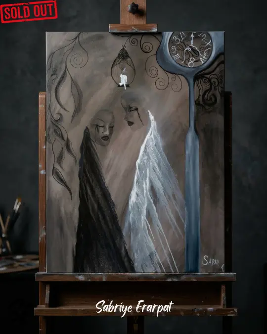 Sembollerin ve Renklerin Dili Eserde ustalıkla kullanılan toprak tonları, varoluşun köklerine ve fani olana atıfta bulunurken; monokrom geçişler, insanın içindeki siyah ve beyazın, iyilik ve kötülüğün sonsuz savaşını temsil eder. Akıp giden zamanı simgeleyen eriyen saat, asılı bir kafesin içinde hapsolmuş ruhun çaresizliğiyle tezat oluşturur. Siyah gözyaşları döken yüzler, bilinçaltının derinliklerindeki söylenmemiş sözlerin ve yaşanmamış yasların görsel bir tezahürüdür. Sabriye Erarpat, bu eserde zamanı bir fizik kuralı olmaktan çıkarıp, psikolojik bir ağırlık olarak tuvale işlemiştir.